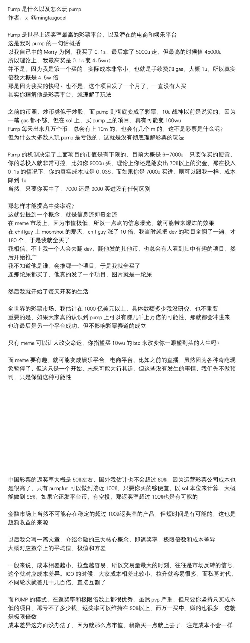 最近听到一个概念,蛮有意思,玩家回报率(Return to Player),也叫返奖率。从 X @minglaugodel 分析 Pumpfun 的彩票流玩法中了解到的。
